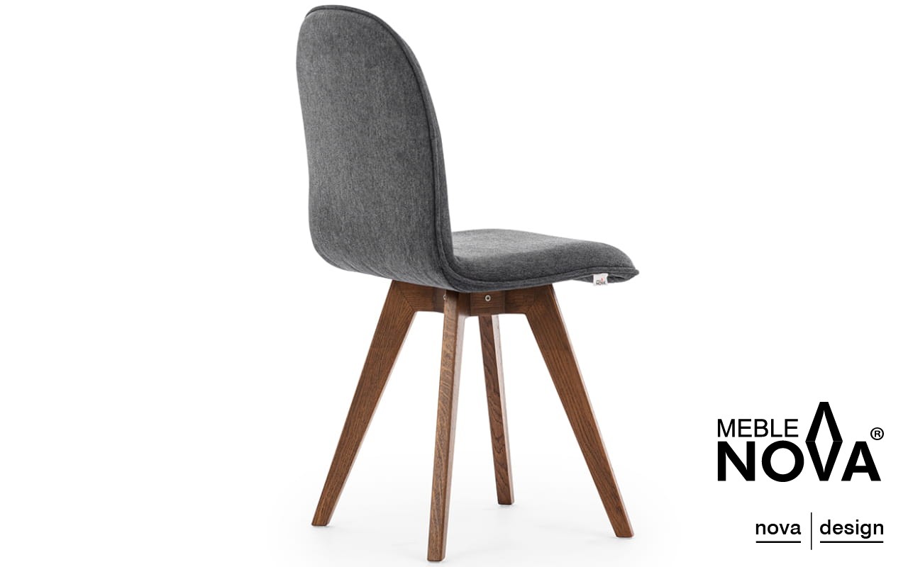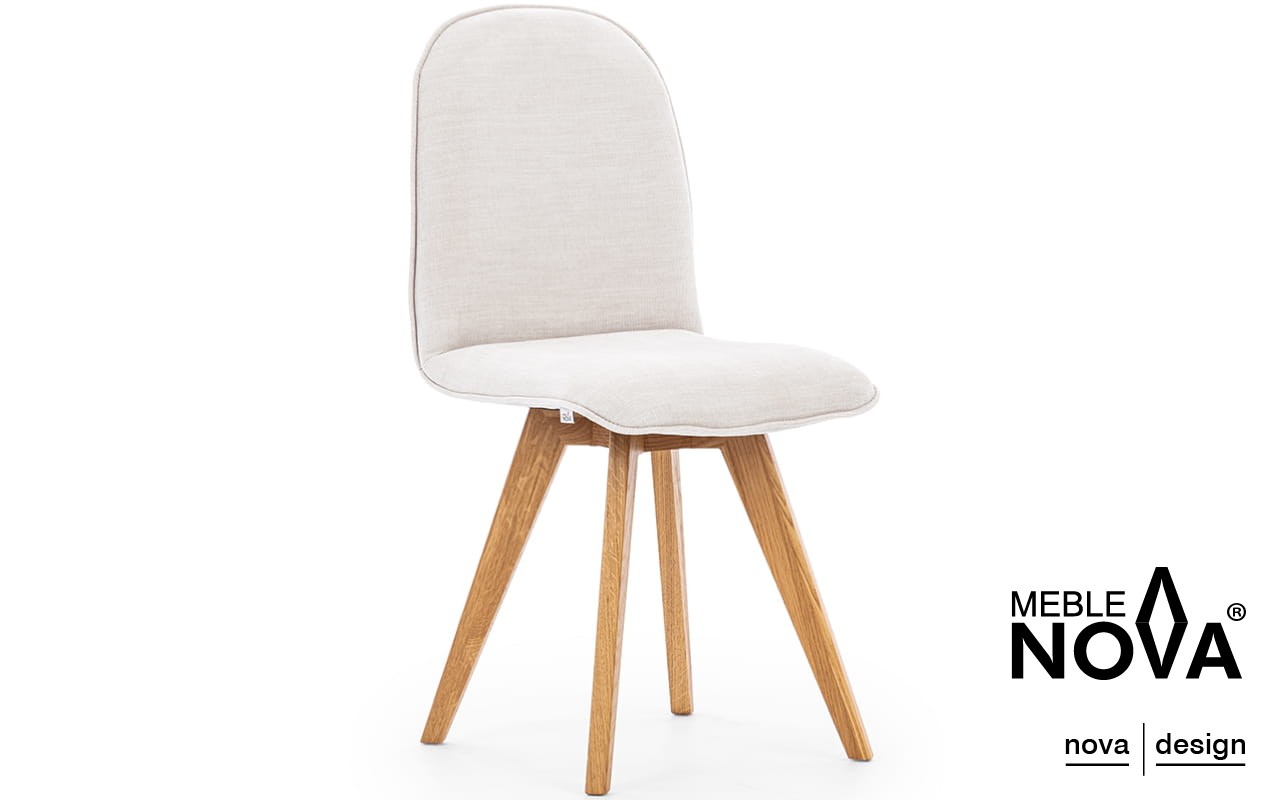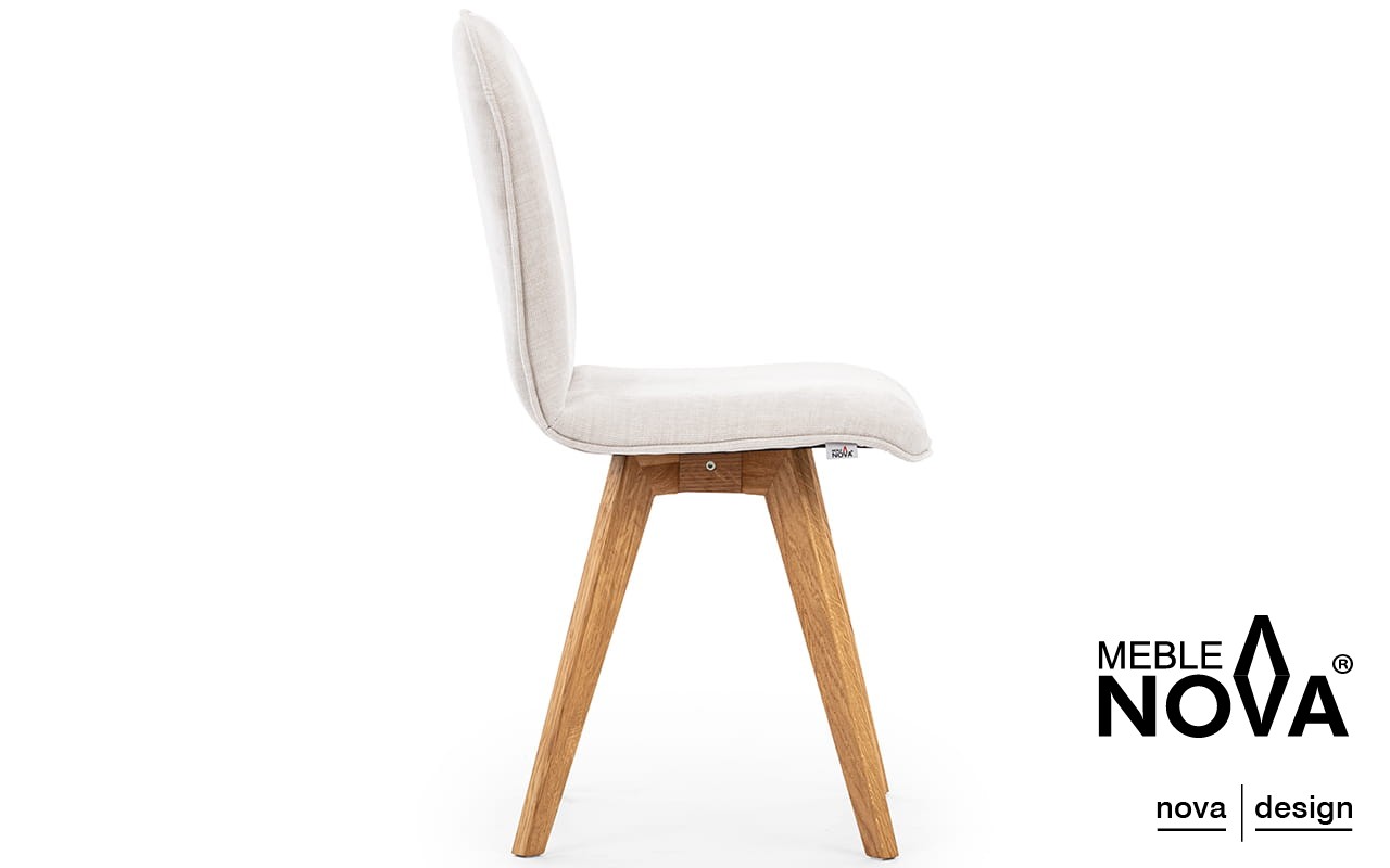 Krzesło Ovo posiada nogi z drewna dębowego, które są skośne i delikatnie wkomponowane w formę mebla, podkreślając jego nowoczesny wygląd.