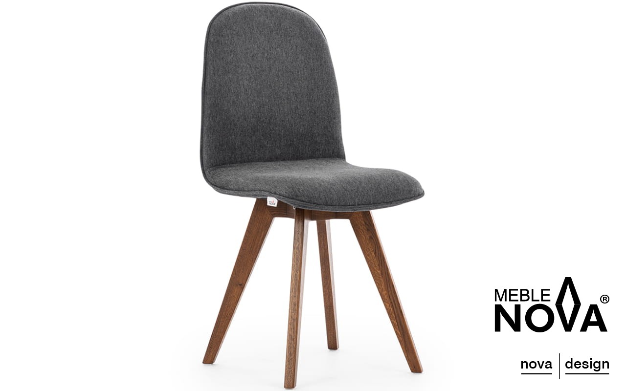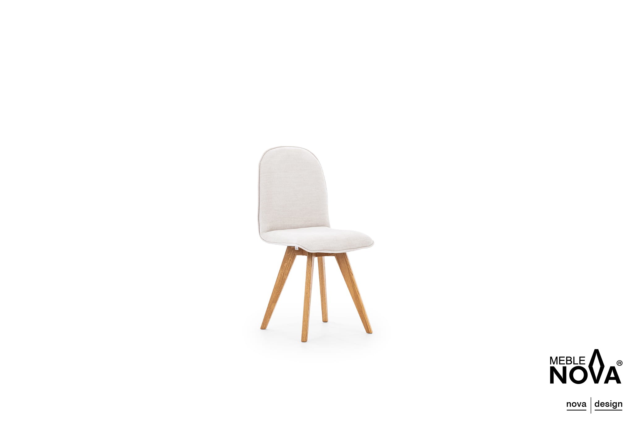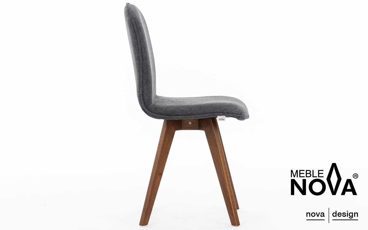 Krzesło Ovo posiada nogi z drewna dębowego, które są skośne i delikatnie wkomponowane w formę mebla, podkreślając jego nowoczesny wygląd.