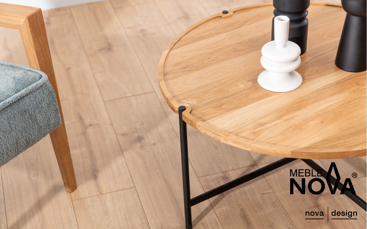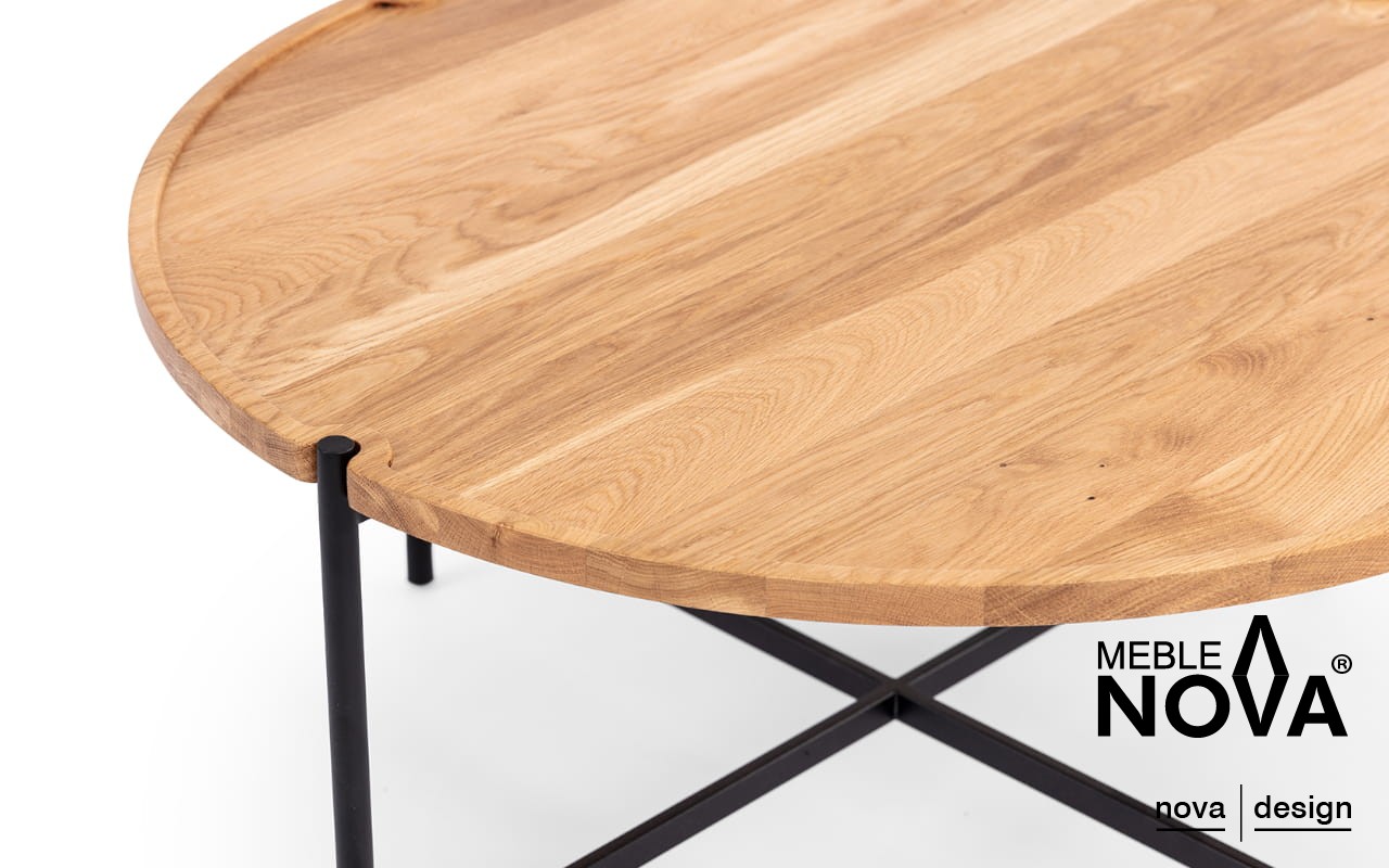 Blat z litego drewna dębowego emanuje ciepłem i elegancją, natomiast czarny stelaż wprowadza subtelny kontrast, idealnie komponując się w nowoczesnych i minimalistycznych wnętrzach.