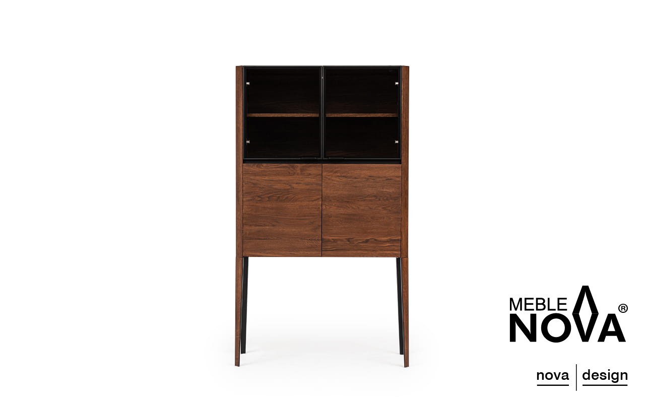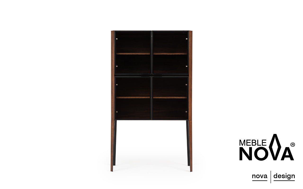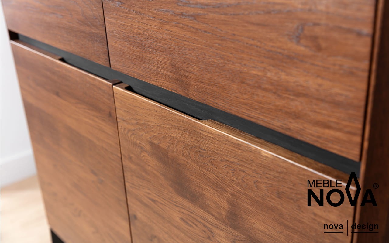 W całości wykonana z drewna dębowego, oferuje możliwość wyboru frontów: pełnych dębowych, całkowicie szklanych lub w wariancie mieszanym – z frontami pół na pół.